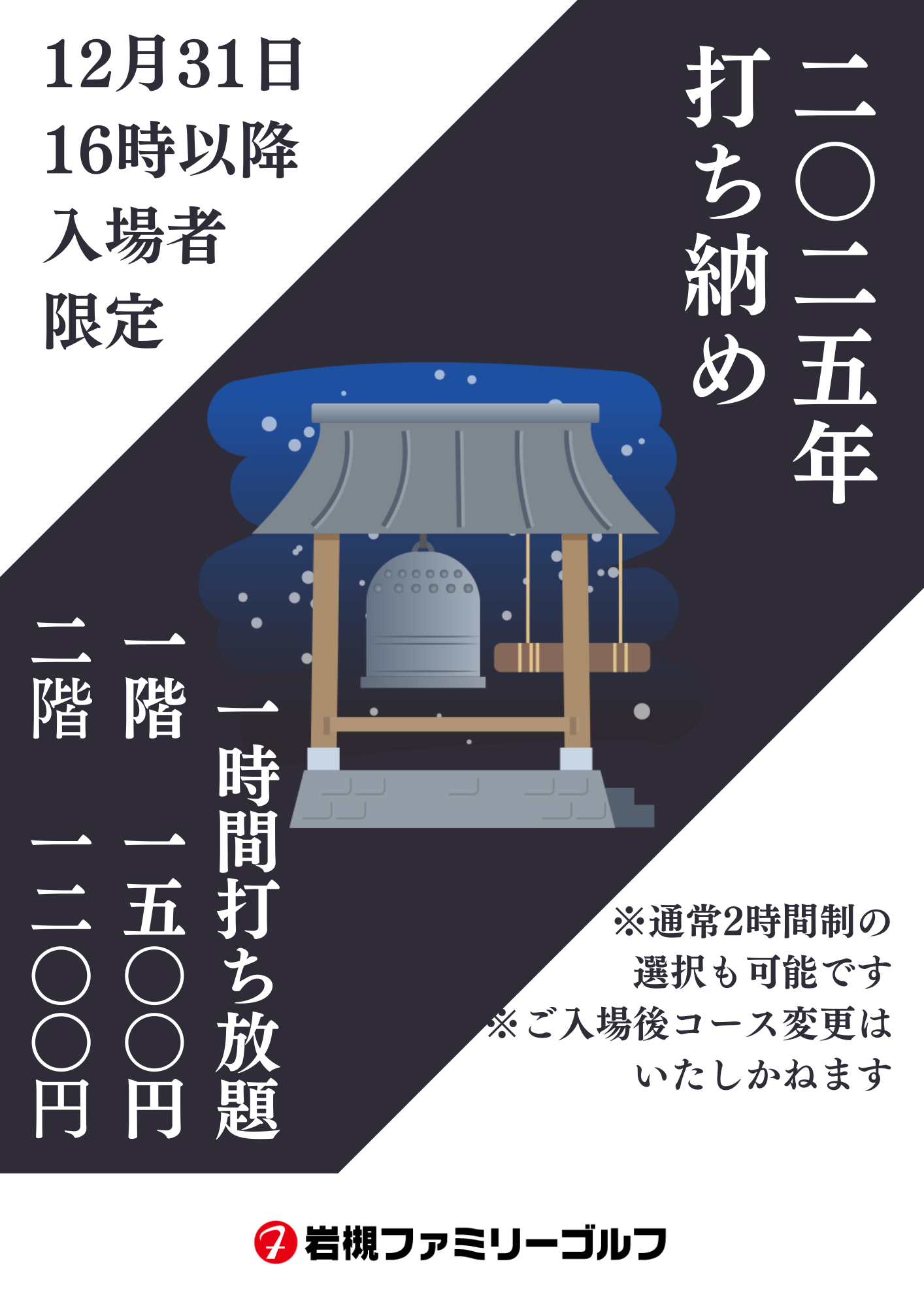 12/31(水)16:00以降1時間制打ち放題キャンペーンを実施致します! 今年の打ち納めに岩槻ファミリーゴルフに足を運んでみてはいかがでしょうか? 通常の2時間制打ち放題も選択できますので、大晦日は是非、当店をご利用く…..