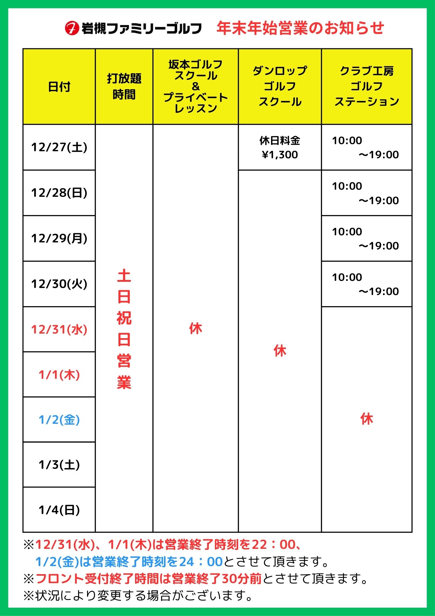 日頃より岩槻ファミリーゴルフをご利用いただきまして誠にありがとうございます。 年末年始営業のお知らせです。 岩槻ファミリーゴルフは年末年始も休まず営業いたします! 一部短縮営業がございますので、お間違えの無…..