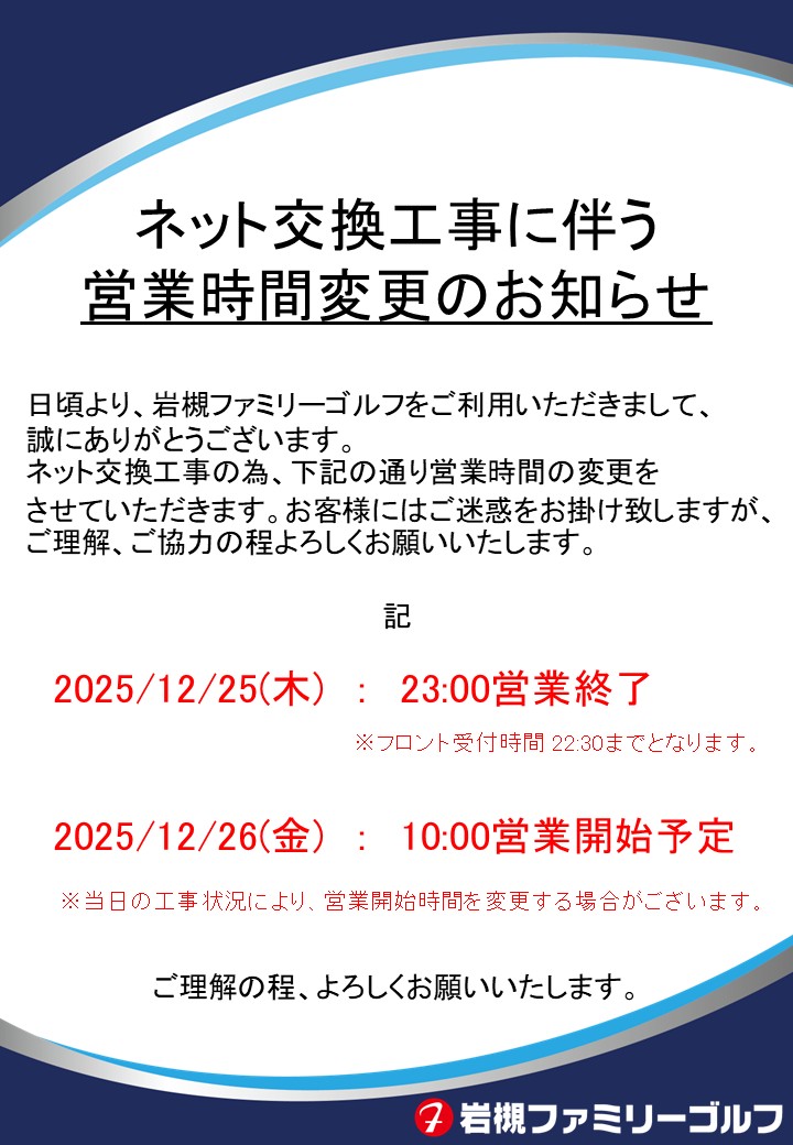 日頃より岩槻ファミリーゴルフをご利用いただきまして、誠にありがとうございます。 ネット交換工事の為、 12/25(木) 23:00営業終了※フロント受付時間22:30まで。 12/26(金) 10:00営業開始予定※状況…..