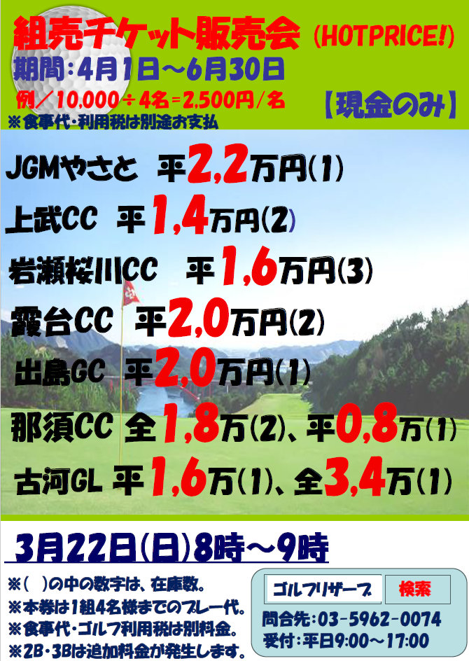 日頃より岩槻ファミリーゴルフをご利用いただき誠にありがとうございます❗️ 3/22(日) 朝8時~9時 岩槻ファミリーゴルフにて、リザーブステーション主催のゴルフ場チケット販売会を開催いたしま…..