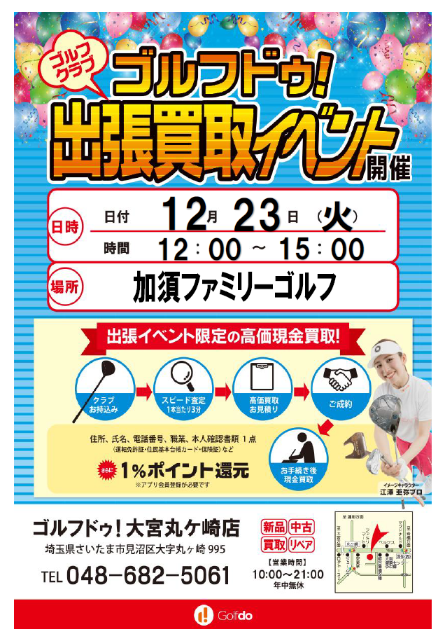 「ゴルフドゥ主催出張クラブ買取イベントのおしらせ」 12/23(火)、12/29(火)12:00~15:00、加須ファミリーゴルフ、クラブハウスにおきまして、ゴルフドゥ大宮丸ケ崎店主催「出張クラブ買取イベント」を開催いた…..