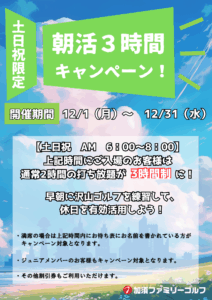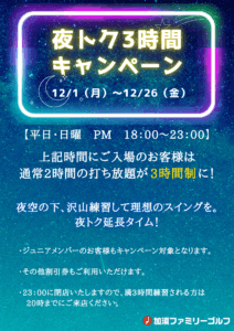 土日祝の6:00~8:00、平日・日曜の18:00~23:00にご入場いただくと、通常2時間制の打ち放題のところ、なんと3時間制に延長させて