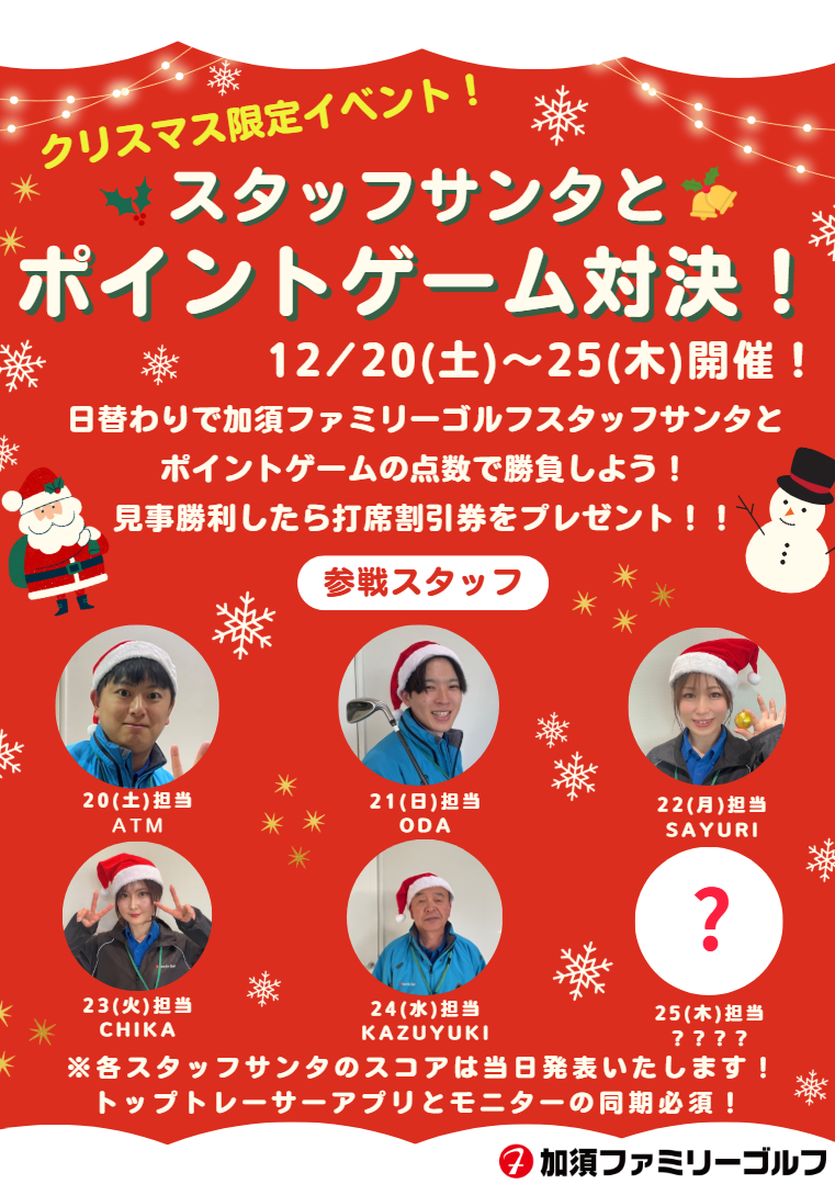 スタッフサンタとポイントゲームのスコアで勝負!日替わりで加須ファミリーゴルフスタッフのスコアを掲示いたします!!