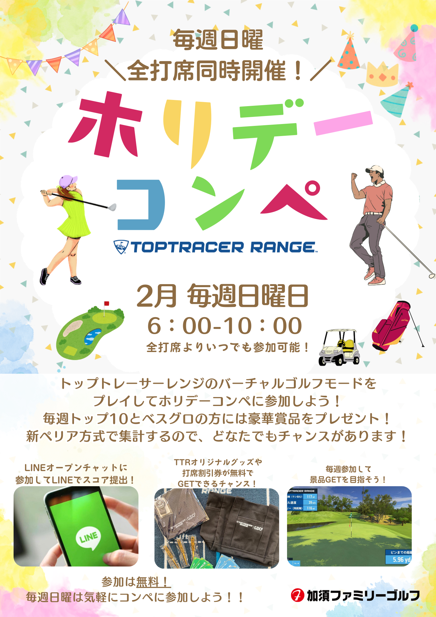 毎週日曜日6:00~10:00でバーチャルゴルフモードを使用したコンペを開催いたします!当日はバーチャルゴルフモードの指定コースをプレイし、LINEのオープンチャットからスコアを提出!当日10位以内にランクイン、またはベスグロを達成された方にはトップトレーサーオリジナルグッズや打席割引券をプレゼント!