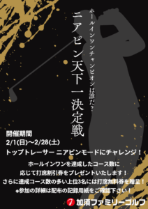 ニアピンモードをプレイしていただき、ホールインワンを達成したコース数に応じて打席割引券をプレゼントいたします!また、ホールインワン達成コース数の多かった上位3名の方には打席無料券を贈呈!