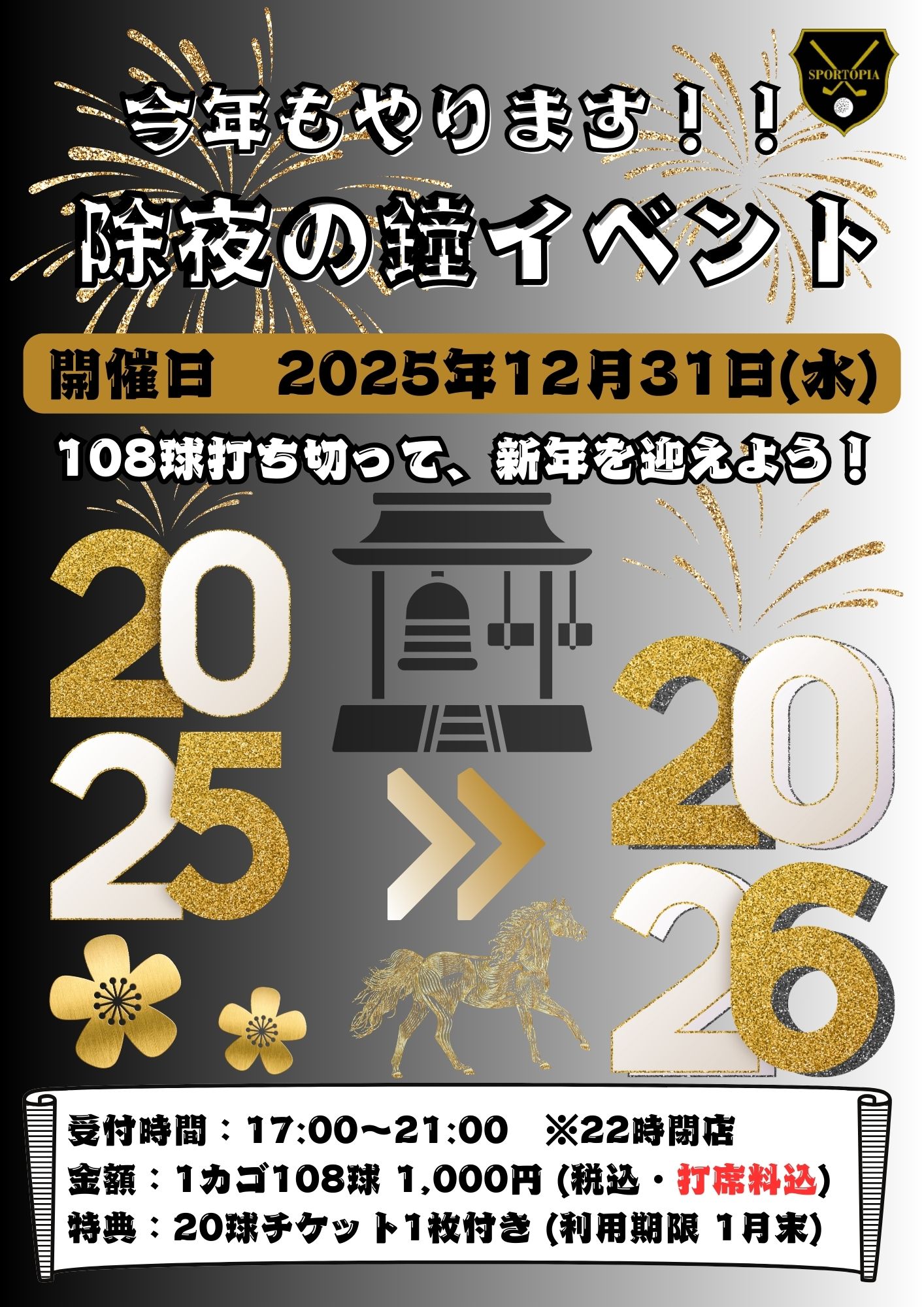 【お得なイベント情報のお知らせ】 こんにちは、スポートピアです。 毎年、12月31日に恒例となっている除夜の鐘イベントを今年も開催いたします✨ なんと、ゴルフ練習ボール108球、打席料そしてゴルフ練習ボール…..