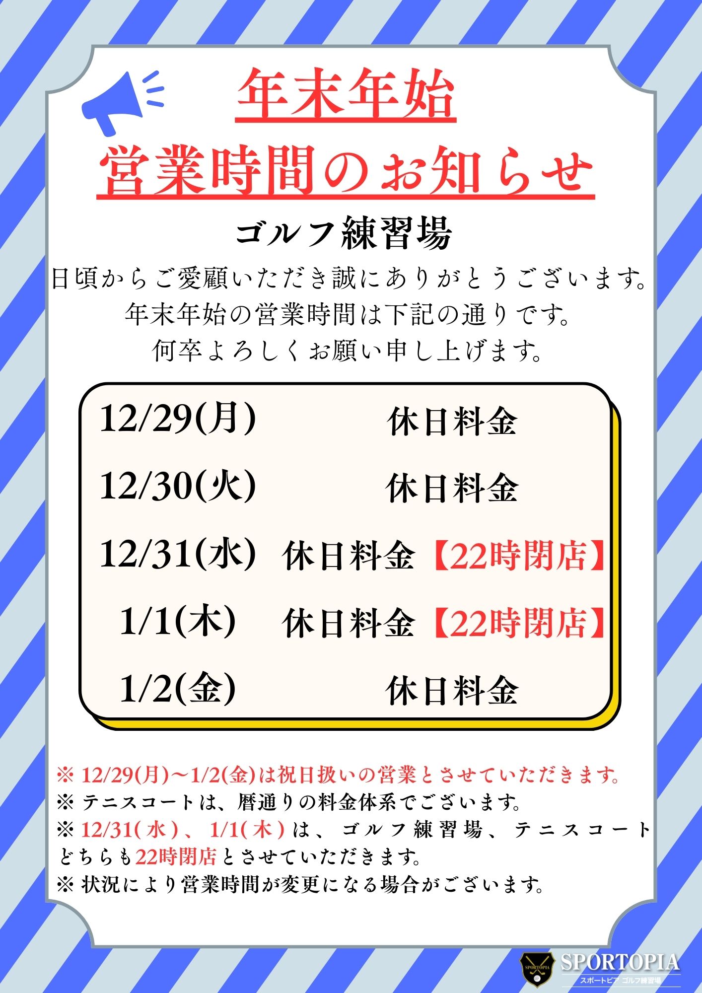 こんにちは、スポートピアです。 日頃からご愛顧いただき、誠にありがとうございます。 年末年始の営業時間は添付写真の通りでございます。 皆様のご来店を心よりお待ちしております。