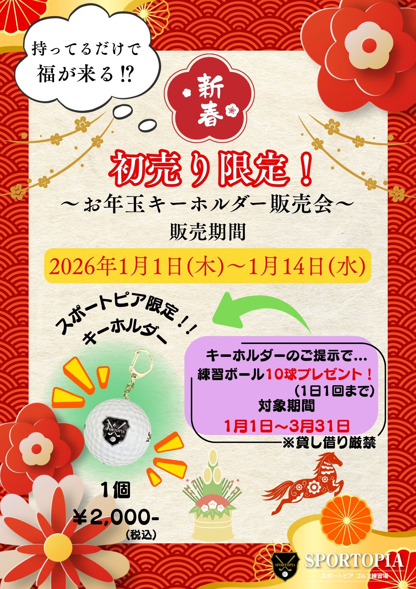 【新春・初売り限定イベント】 こんにちは、スポートピアです⛳ 1月1日より、スポートピアのフロントにてお年玉キーホルダーを販売いたします! なんと、1月1日~3月31日までの期間は、こちらのキーホルダーをフ…..