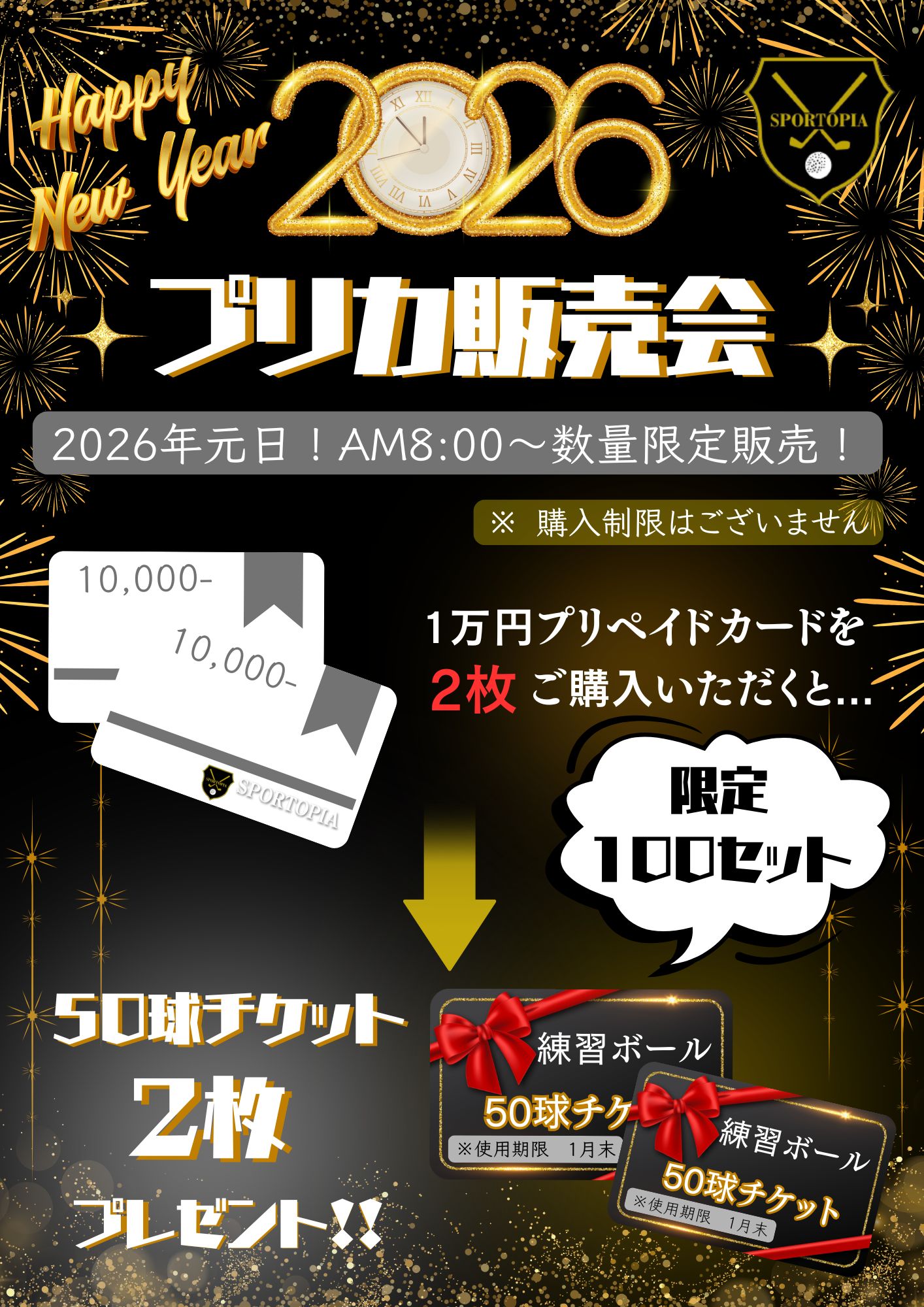 新春!プリカ販売会のお知らせ✨ こんにちは!スポートピアです⛳ 2026年1月1日AM8:00~恒例のプリカ販売会を開催いたします! 1万円プリペイドカードを2枚ご購入いただくと、練習ボール5…..