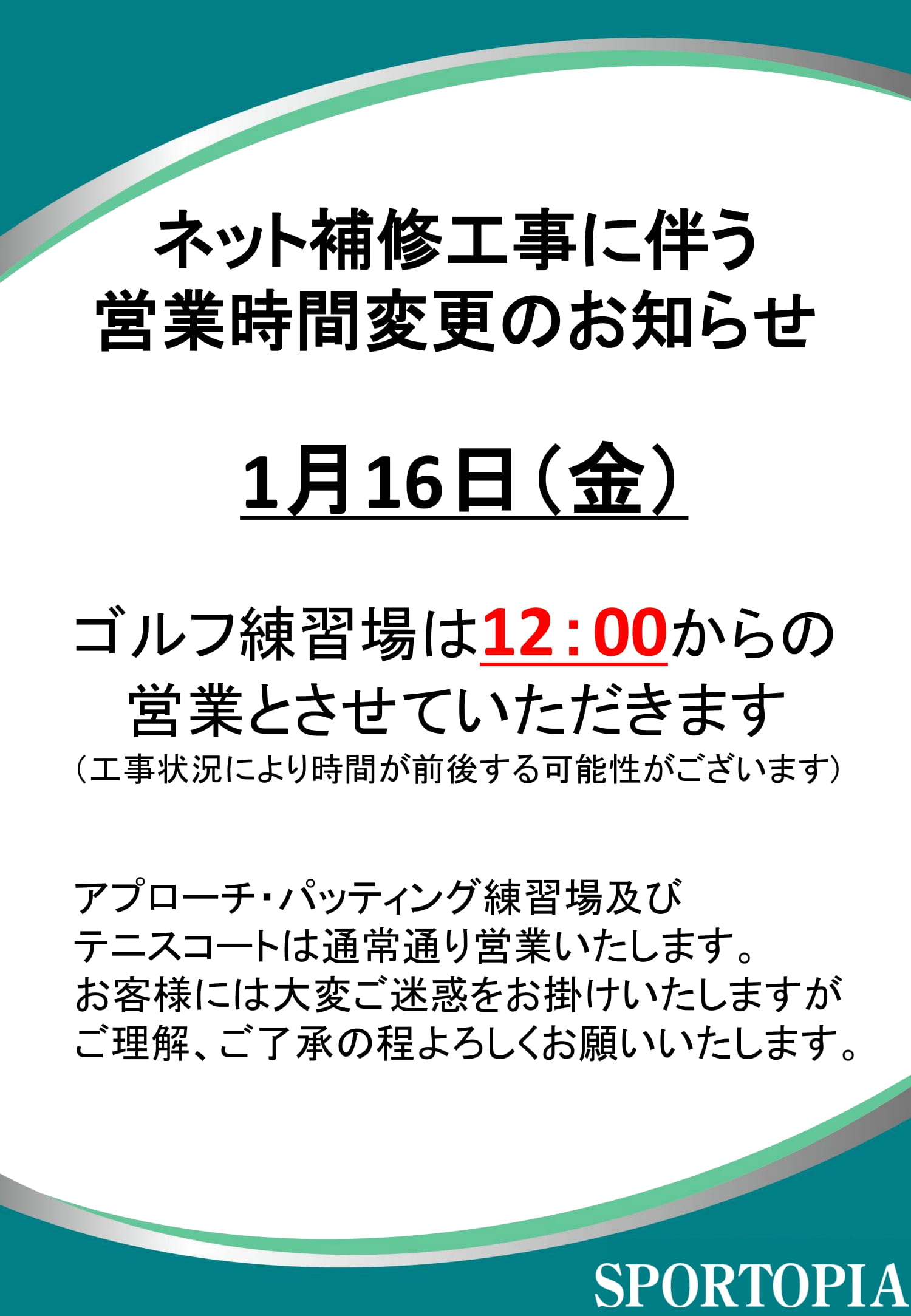 2026年1月9日 【お知らせ】ネット補修工事に伴う営業時間変更のお知らせ