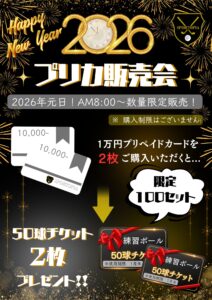 1万円プリペイドカードを2枚ご購入いただくと、練習ボール50球チケットを2枚プレゼントいたします! なんと100球分もお得!! 限定100セットの販売! 売り切れ次第終了ですので、お早めにお買い求めください!