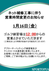 【お知らせ】 1月16日(金)はネット補修工事のためゴルフ練習場の営業を12時からとさせていただきます。 お客様には大変ご迷惑をお掛けいたしますが何卒ご理解、ご了承の程よろしくお願いいたします。 ※工事状況により営業時間が前後する可能性がございます。 ※アプローチ練習場、テニスコートは通常通り営業いたします。
