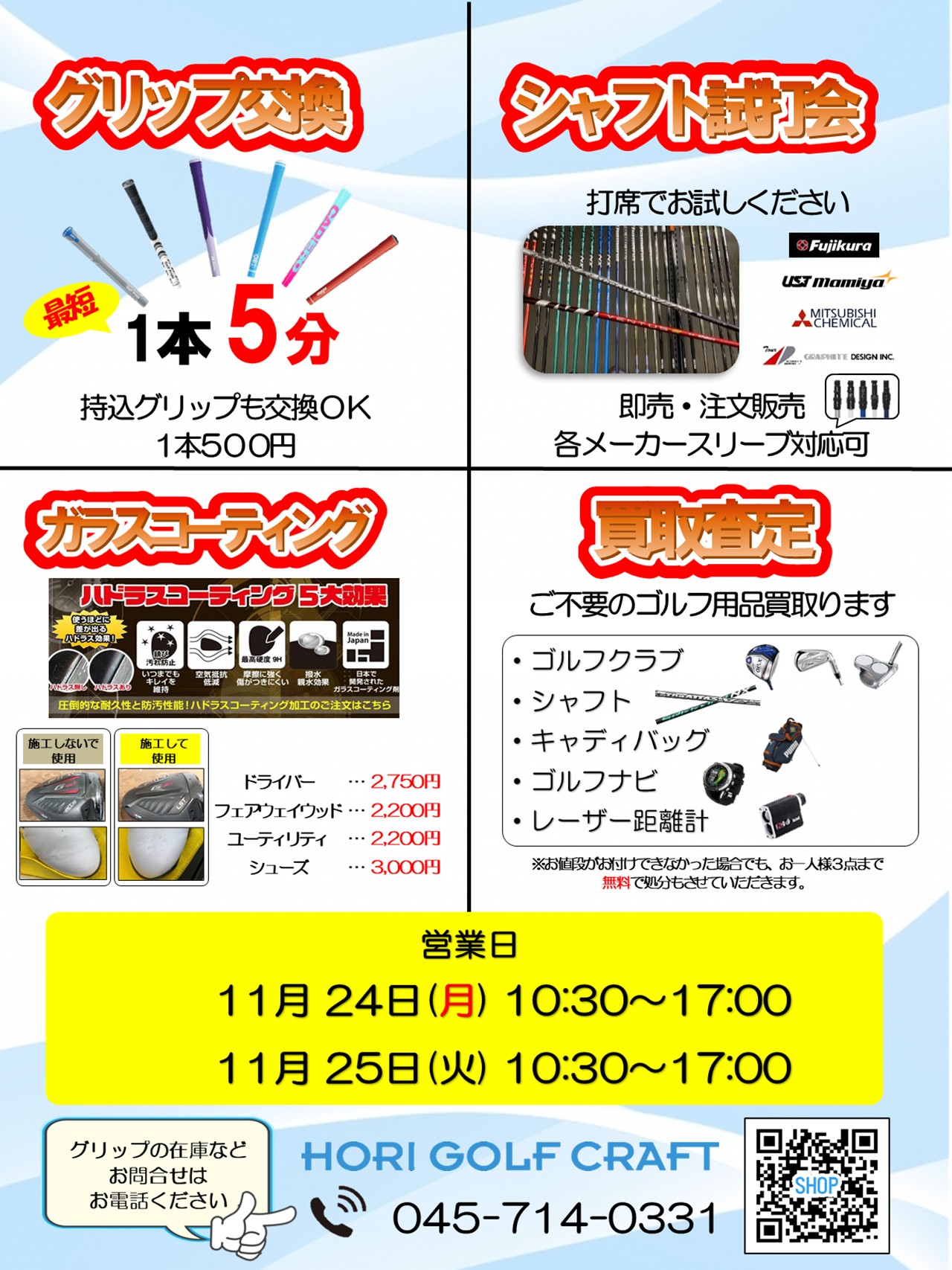 11月24日(月)・25日(火)の2日間、10:30~17:00 にてホリゴルフクラフトによる出張工房を開催いたします。 当日は下記サービスをご利用いただけます👇 🧤 グリップ交換 &#x…..