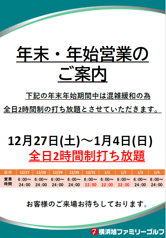 横浜旭ファミリーゴルフは、年末年始も休まず営業いたします。 12/27(土)〜1/4(日) 期間中は混雑緩和のため、全日2時間制とさせていただきます。 営業時間 通常:6:00〜24:00 ※ 12/31(水)・1/1(…..
