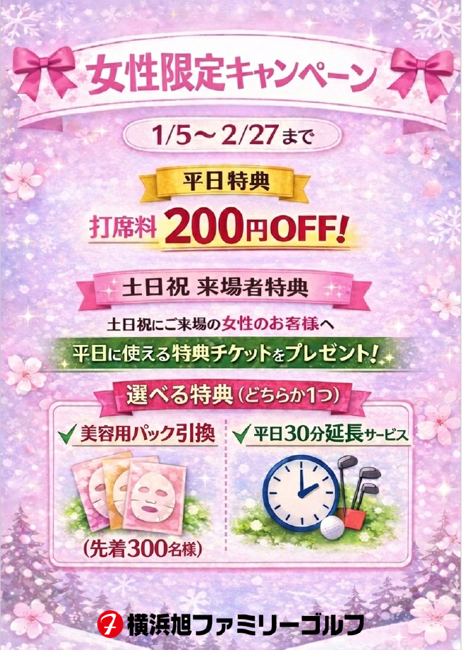 2026年1月5日(月)〜2月27日(金)まで女性のお客様限定のお得なキャンペーンを開催いたします。 【平日特典】 期間中、平日にご来場の女性のお客様は打席料が200円OFFとなります。 【土日祝 来場者特典】 土日祝日…..