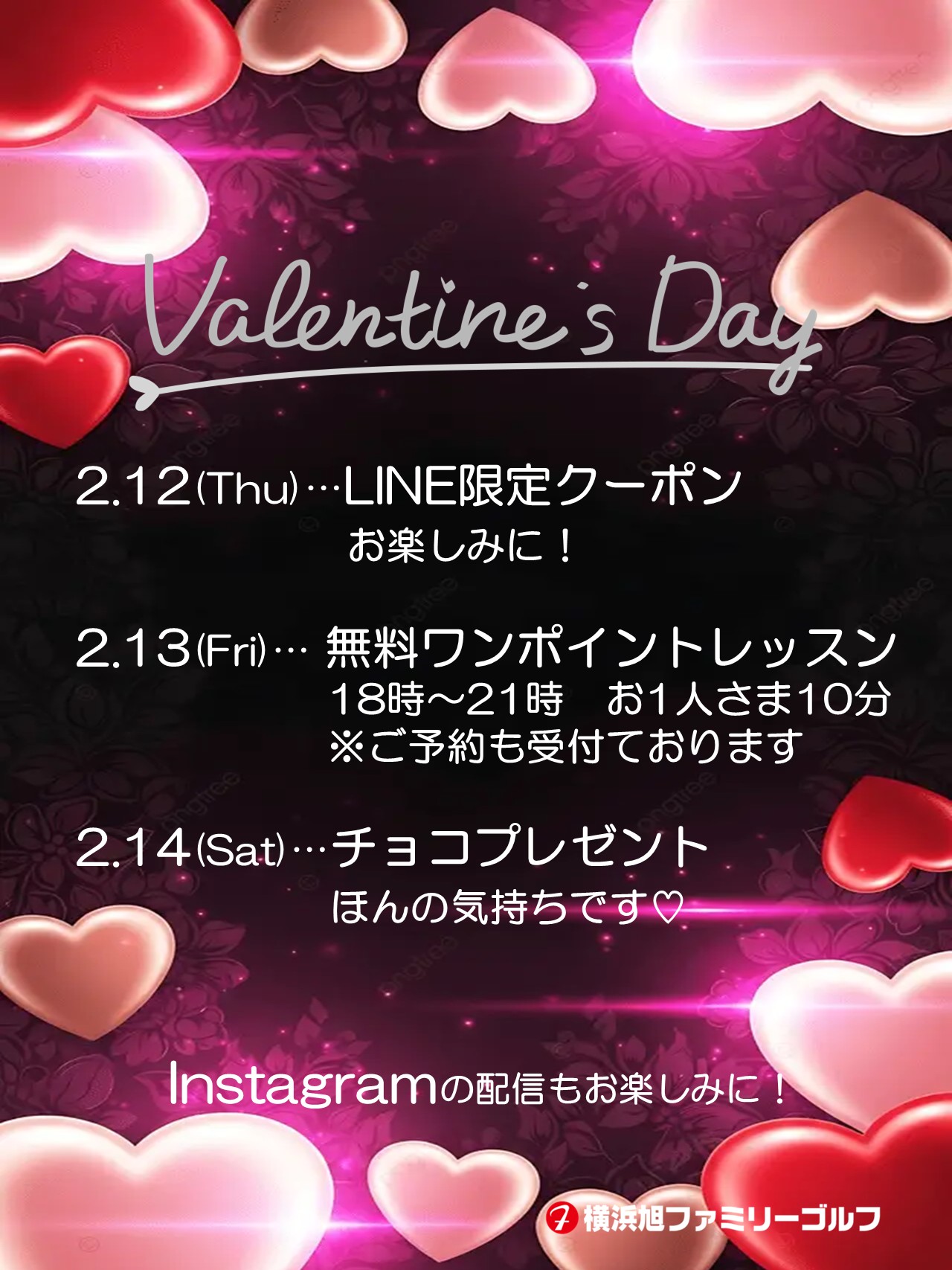 2/12~2/14はちょっとお得に! LINEやインスタでクーポンを配信いたします。 13日はインストラクターによる無料ワンポイントレッスンも開催します。 事前予約を受付中です。 お楽しみに♪