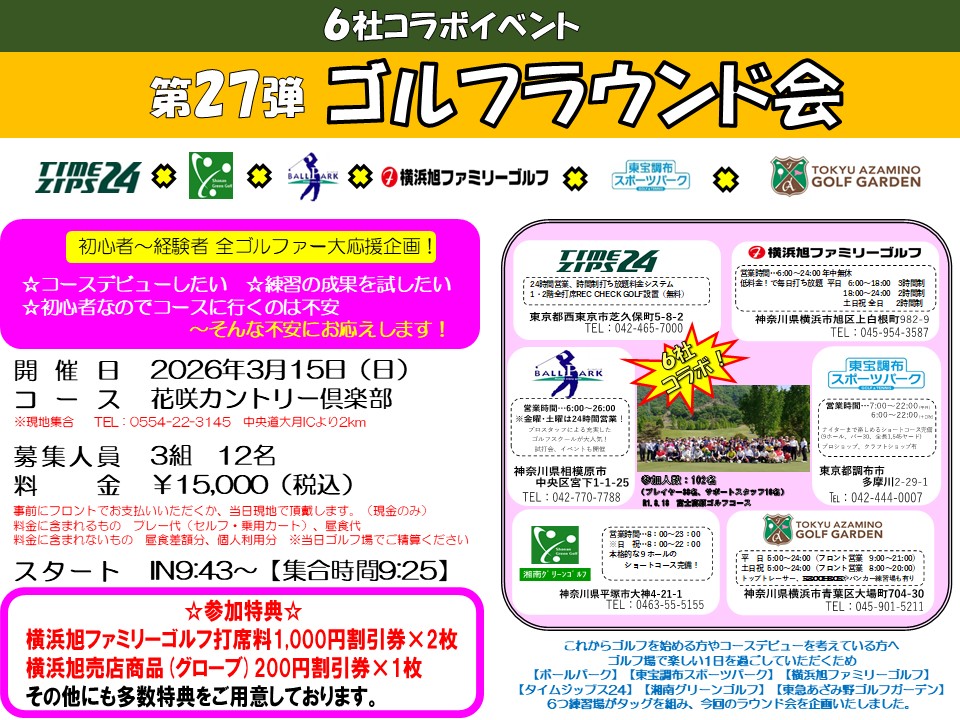 〜お知らせ〜 3月15日(日)に花咲カントリー 倶楽部にて、第27弾コラボラウンド会を開催いたします‼️ 優しめのコースで、ゴルフデビューの方や、初心者の方にはスタッフがサポートにつきます&#…..