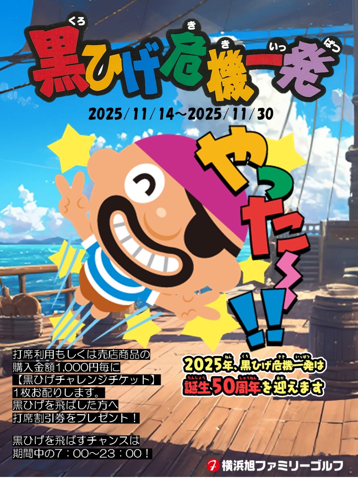 🎯\黒ひげチャレンジイベント開催!/🎯期間:2025年11月14日(金)~11月30日(日)[16日間] 打席利用または物販購入で「黒ひげチケット」をGET✨チケット1枚で1…..