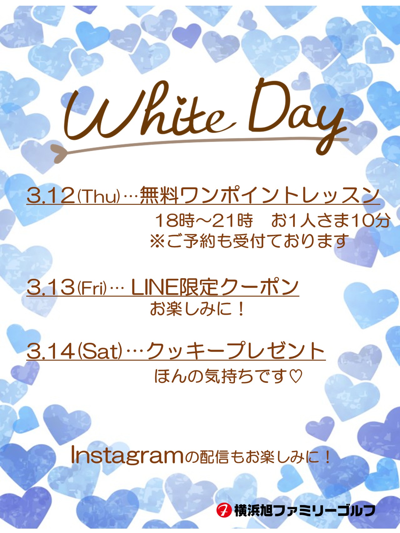 3/12~3/14はちょっとお得に! LINEやインスタでクーポンを配信いたします。 12日はインストラクターによる無料ワンポイントレッスンも開催します。 事前予約を受付中です。 お楽しみに♪