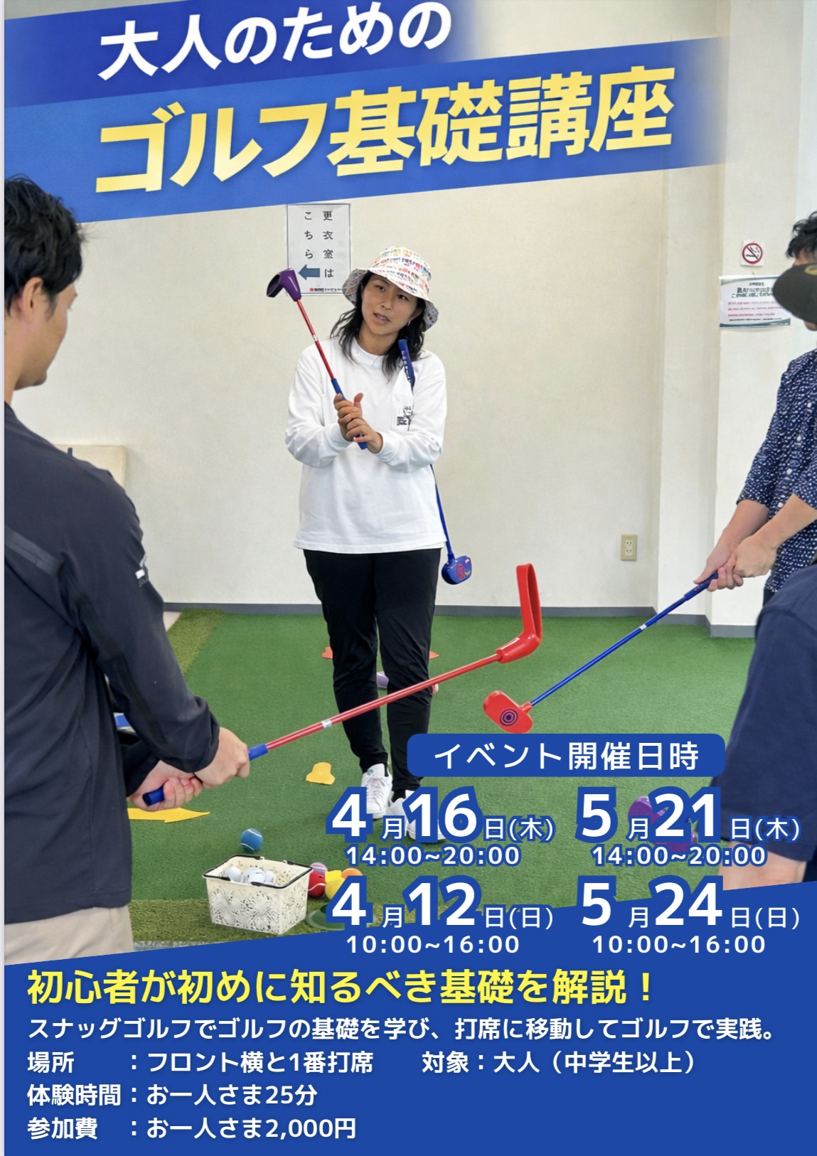 「ゴルフを始めたいけど何から始めればいいかわからない…」 「自己流でやっているけど基礎をちゃんと学びたい」 そんな方におすすめのイベントです😊 スナッグゴルフで基礎を学び、 その後実際の打席でゴルフを体験…..