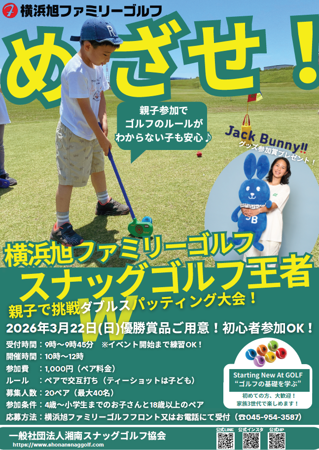 🎉 親子で挑戦!スナッグゴルフ王者決定戦 🎉 横浜旭ファミリーゴルフ屋外パッティング場にて行う親子ダブルス パッティング大会を開催します! 「ゴルフは初めて…」「ルールがわからない…」そん…..