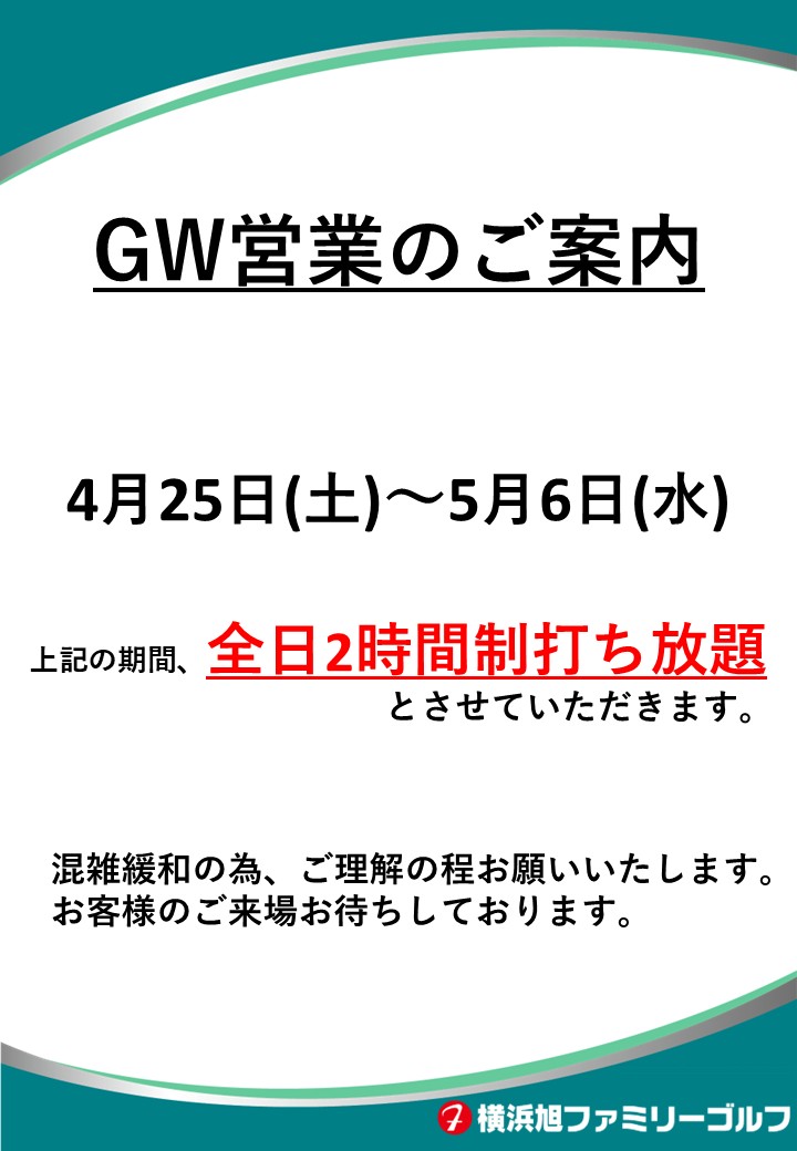 4/25(土) ~ 5/6(水) の期間は終日2時間制での営業とさせていただきます。 混雑緩和の為、ご理解の程よろしくお願いいたします。